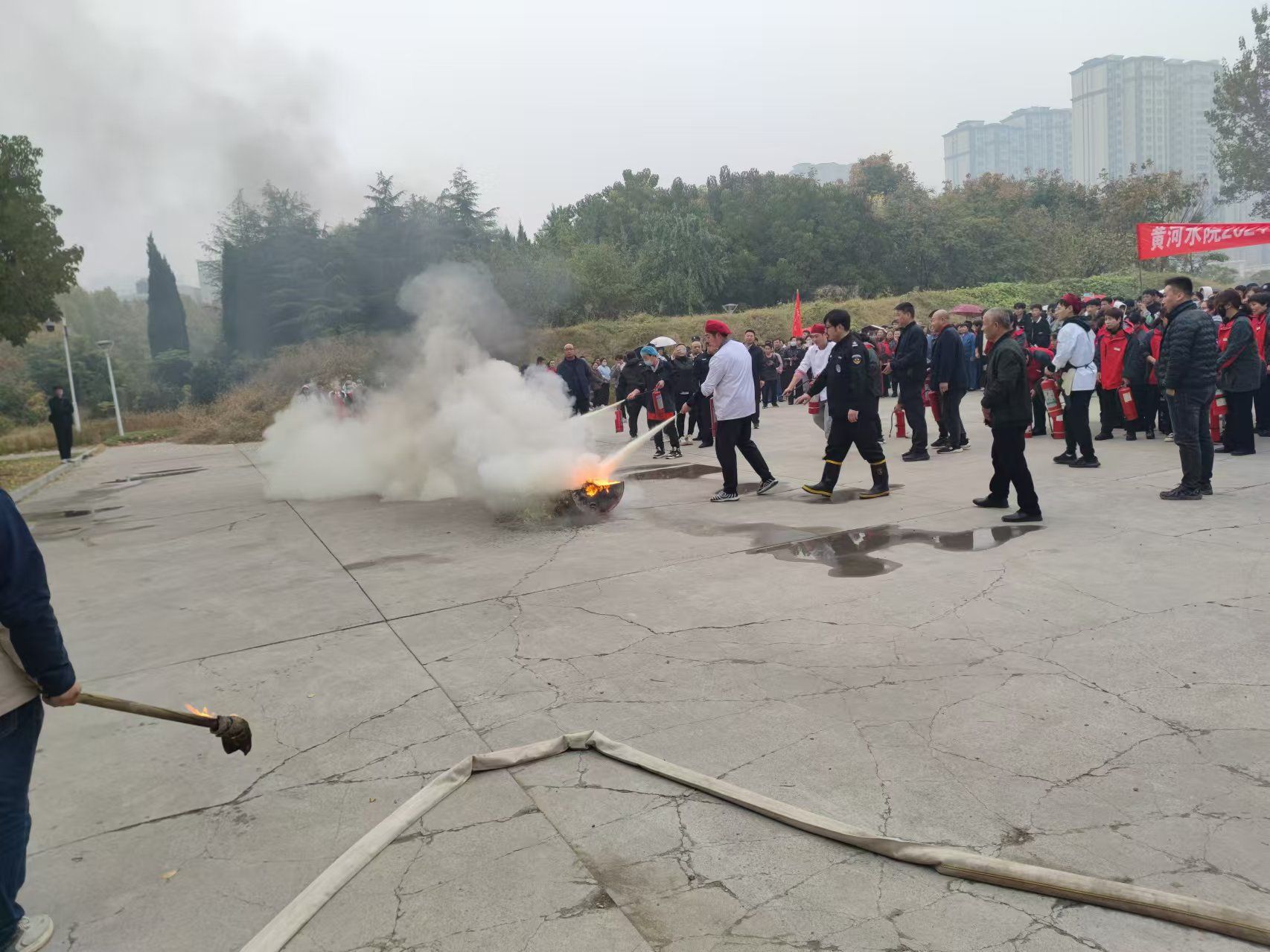 现场分组过后,灭火演练正式开始,大家按照指令,有秩序地分批拿起灭火器冲向火场,迅速将大火扑灭。通过让大家亲临火灾的“发生”,了解并掌握如何在第一时间正确灭火。参加演练的师生员工们切实体会到火灾发生时掌握安全自救技能的重大意义。