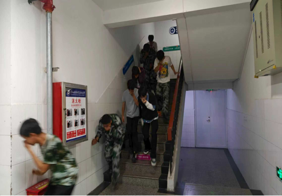 在模拟疏散逃生前,讲解发生火灾时弯腰低姿捂口鼻的逃生要领。随后在宿舍楼结合实际场景,由学校保卫处人员按响了消防报警按钮,同学们按照动作要领和指导下迅速下楼,全面检验学生应对突发火情的反应能力和疏散自救技能。