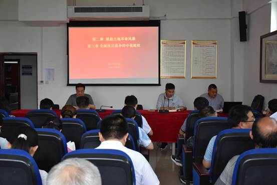 李书记带领大家回顾了中国近代以来土地革命的发展历程和中国共产党领导中国人民全面抗日的过程,并结合中国土地政策的变迁,谈了自己的感受。学习结束后,学院老师结合自己的生活谈了对中国土地革命运动和抗日战争的感受。