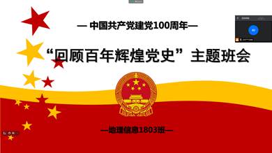 4月27日,为认真贯彻落实习近平总书记在党史学习教育动员大会上的重要讲话精神,传承红色基因,刘剑锋老师召开了地理信息1803班“回顾百年辉煌党史”主题班会,向中国共产党成立100周年献礼。由于本学期学生顶岗实习,目前分布在全国各地,本次会议采用线上会议形式开展。