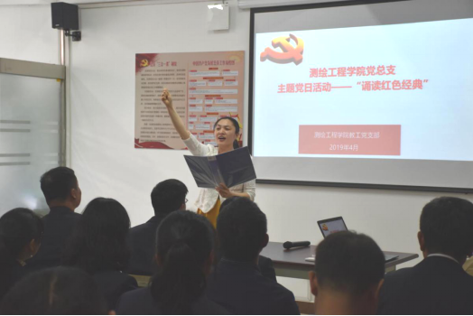 为迎接建党98周年和新中国成立70周年,将红色基因进一步根植于支部党员心中,测绘工程学院党总支积极深化红色基因内涵,探索传承红色基因的新形式,结合学校4月份读书月活动,于2019年4月30日开展了“诵读红色经典”主题党日活动,由徐琳老师主持。