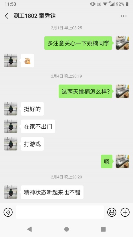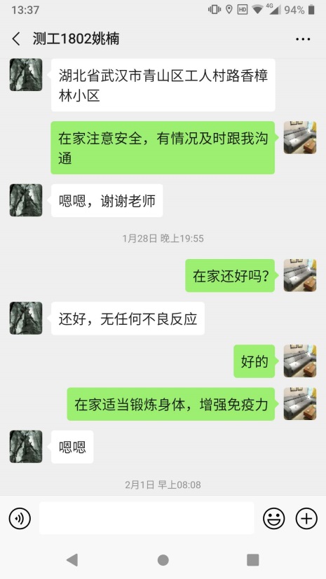 姚楠,测绘技术1802班学生,家住湖北省武汉市青山区工人村路香樟林小区。疫情暴发以来,该生一直在居家隔离。辅导员老师通过微信、电话等多种方式与学生进行沟通交流,时刻关注学生的状态,将组织的关怀带给他,告诉学生,有组织在,你就不是一个人在战斗,有需要,请及时告诉组织。为避免学生产生过度紧张的情绪,嘱咐班干部平时多跟该生交流,抗疫路上,一个都不能少。