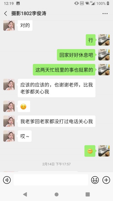 李俊涛,摄影测量1802班班长,家住河南省开封市顺河回族区六王满路满洲庄。疫情暴发以来,有过2次感冒发烧症状。每次,辅导员老师都会主动跟该生联系,掌握学生状况,及时向上级汇报情况。214日下午,该生第二次突然发烧,因是疫情期间,学生情绪高度紧张,赶紧到开封市人民医院进行全方位检查。辅导员老师第一时间掌握了学生的情况,一方面让学生保持良好的心态,一方面向领导汇报最新情况,保证信息能够及时反馈。经最终诊断,该生为普通伤风感冒。辅导员老师高度负责的态度深深打动了学生。