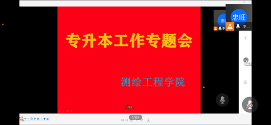 63日,测绘工程学院辅导员李忠旺召开了“专升本工作”主题网络班会,主题班会由辅导员李忠旺主持,班会上讲解了专升本工作的有关事项,特别讲解了“诚信考试”的重要性。