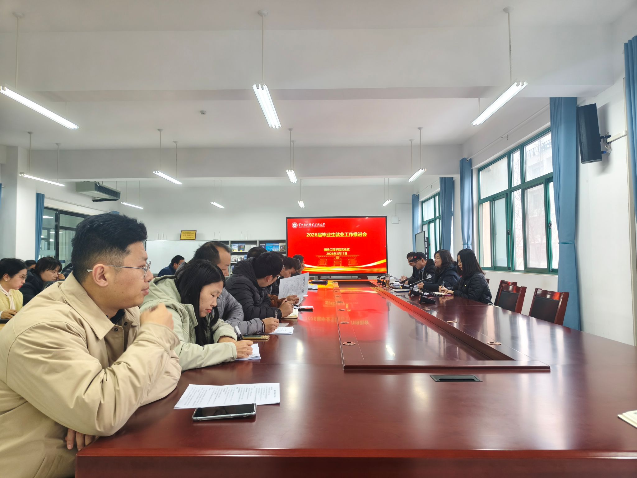 为扎实推动2026届毕业生就业工作,助力学生顺利就业,3月17日下午,测绘工程学院组织召开了2026届毕业生就业工作推进会。学院领导班子、2026届毕业班辅导员、学生岗位实习指导老师及校企合作办公室相关教师共同参会。