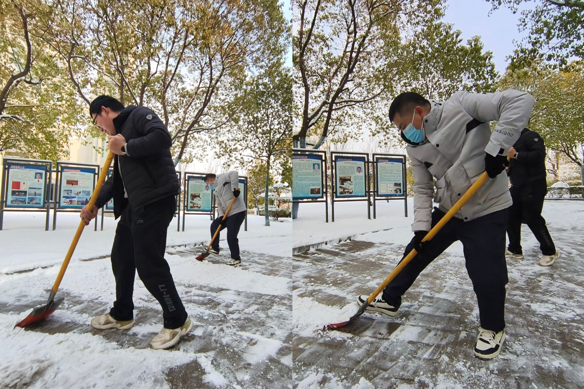 寒风凛冽,党员教师们不畏严寒,挥动铁锹,默契配合,最终在5号至8号实训楼之间开辟出一条安全畅通的道路,为师生的正常出行保驾护航。