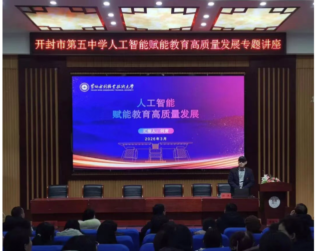落实开封市中小学科技教育教联体工作安排,促进人工智能与教育教学的深度融合,助力基础教育教师提升数字素养与专业能力,2026年3月2日,永利官网测绘工程学院院长、市中小学科技教育教联体成员何宽教授受邀为开封市第五中学全体任课教师作题为《人工智能赋能教育高质量发展》的专题讲座。