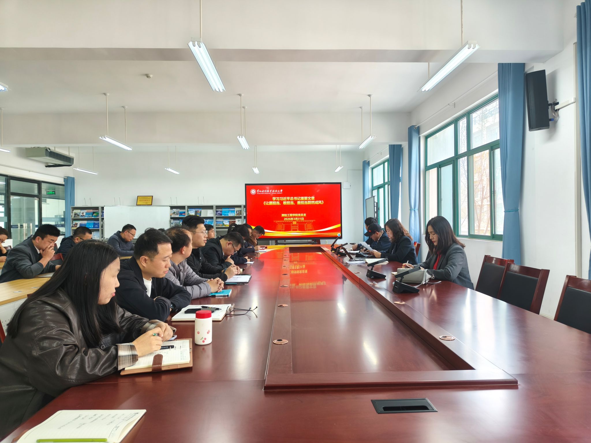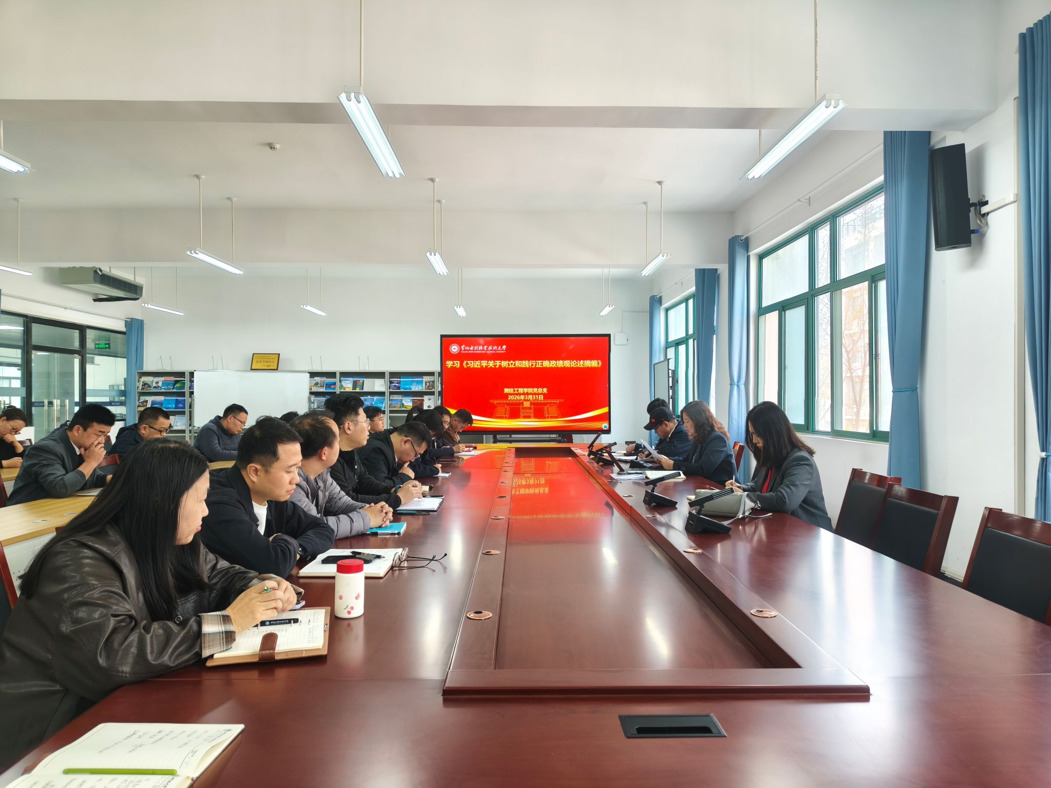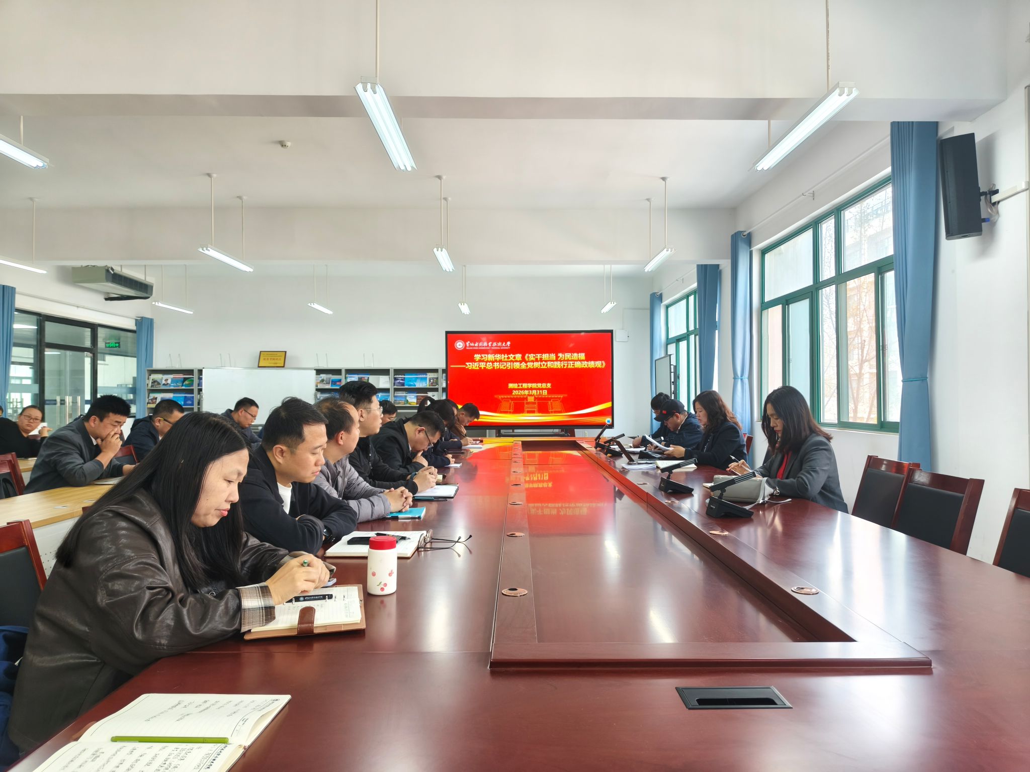 3月31日,测绘工程学院在SY6307开展2026年下半年第二次政治理论学习专题会,党总支书记高琼领学《习近平关于树立和践行正确政绩观论述摘编》、习近平总书记重要文章《让愿担当、敢担当、善担当蔚然成风》和新华社文章《实干担当为民造福——习近平总书记引领全党树立和践行正确政绩观》。