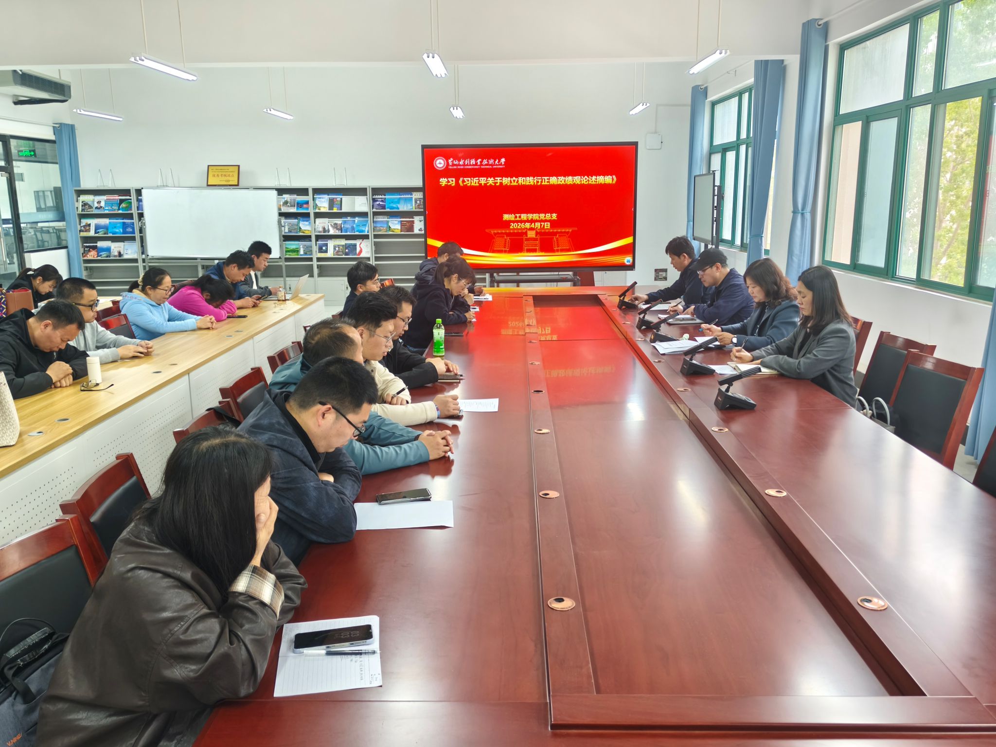 4月7日,测绘工程学院召开专题学习会,组织全体教职员工集中学习《习近平关于树立和践行正确政绩观论述摘编》,并开展交流研讨。学习会由党总支书记高琼主持。