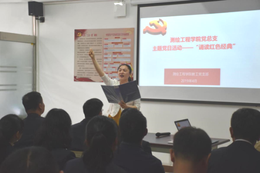 为迎接建党98周年和新中国成立70周年,将红色基因进一步根植于支部党员心中,测绘工程学院党总支积极深化红色基因内涵,探索传承红色基因的新形式,结合学校4月份读书月活动,于2019年4月30日开展了“诵读红色经典”主题党日活动,由徐琳老师主持。
