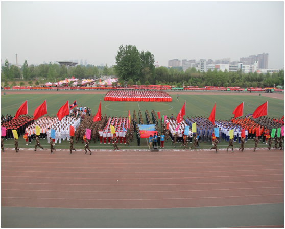 旌旗飘飘,鼓声铿锵。14日清晨,学院领导和同学们已经入场就位了。场中老师和同学们脸上是难以遮挡的活力和热情。伴随着催人奋进的旋律,国旗护卫队、彩旗队、造型队、各院系方块队迈着整齐有力的步伐走过主席台,接受领导和老师的检阅。其中造型队和彩旗队是开幕式的一大亮点, 近六百名同学整齐划一的动作,矫健优美的舞姿,形象生动的造型,使全场欢声雷动,掌声和欢呼声一浪高过一浪。最后,刘国际校长宣布,2016年春季运动会开幕。
