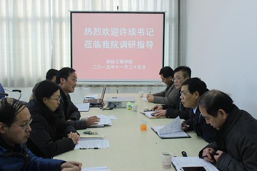 2015年11月25日14点30分,yl8cc永利官网党委书记许琰在校纪委书记张豫东、校党委副书记刘卫锋、校党政办主任刘玉斌、校党委宣传部部长于兆国陪同下来到测绘工程学院调研。测绘学院党总支书记纪勇、院长陈琳分别从部门基本情况、发展现状、人才培养、教育教学、管理服务、当前的主要工作、存在的问题、今后的打算与建议等方面进行了全面详实汇报向许书记做了工作汇报。许书记一边听取汇报,一边有针对性的进行解释、探讨,为学院领导班子答疑解惑。