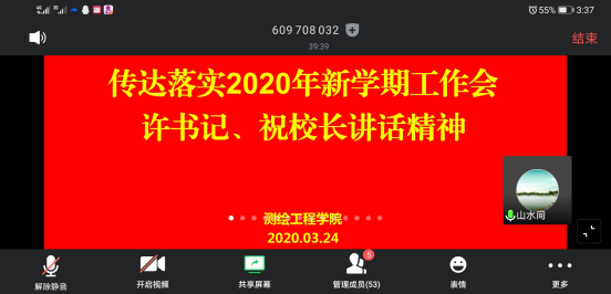 3月24日下午,测绘工程学院召开全体教职工的视频语音会议,会议由院长陈琳主持,院长陈琳领学了3月20日许书记、祝校长在《yl8cc永利官网2020年新学期工作会议》上的讲话。