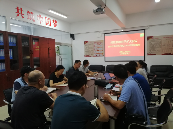 大家首先集体学习了“出彩河南人”2020最美教师的先进事迹,每位参会的同志被这些最美教师的先进事迹所感染,深受感动。接着每人谈了自己的学习心得体会,大家一致认为要向这些先进的人物学习,做好自己的本职工作,培养出更优秀的人才。最后陈琳院长做了总结发言,纪勇书记就如何发挥党员的模范带头作用做了要求。