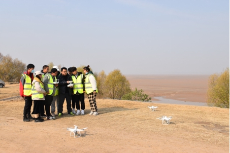 王懿老师带着学生在这里进行无人机的实景三维测量。无人机航测是以无人驾驶飞机作为空中平台,以机载遥感设备,如高分辨率CCD数码相机、轻型光学相机、红外扫描仪,激光扫描仪、磁测仪等获取信息,用计算机对图像信息进行处理,并按照一定精度要求制作成图像。在黄河大堤上进行无人机测量不仅仅让同学们学到了专业知识和实操技能,并且让同学们感受到了黄河的雄伟磅礴。