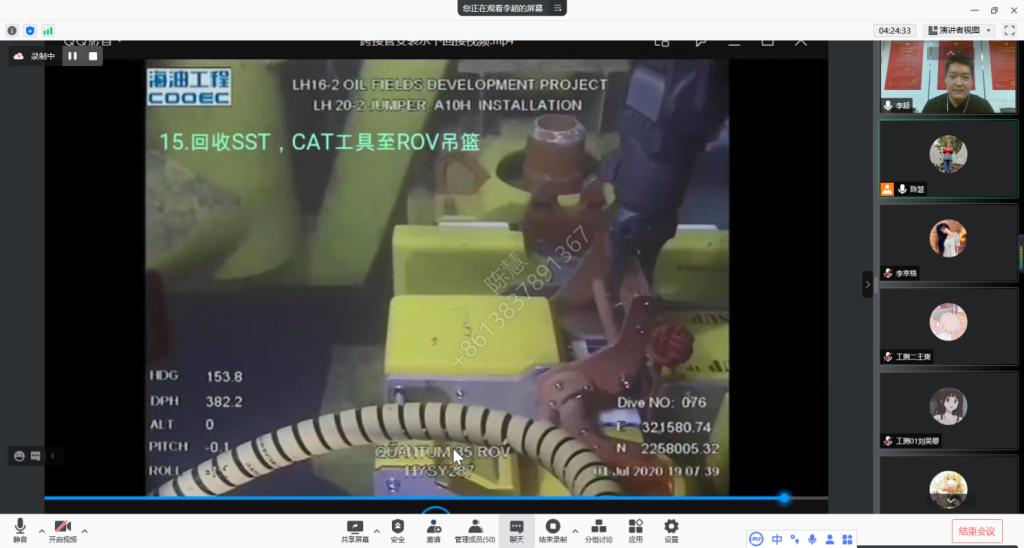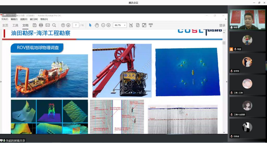 本次讲座中,李经理围绕着海洋工程测量技术应用与发展前景,从海洋石油领域工程测量技术应用场景介绍、北斗融合DGNSS技术应用现状与发展前景、水下定位技术原理应用与发展前景、水下结构/管线检测技术应用与发展前景、海洋工程测量行业就业前景五个方面,逐一详细展现了海洋测量项目实际作业中涉及工程测量的应用场景,介绍了相关的作业流程和注意事项,其间还插播了两段海洋工程测量作业时的短视频。
