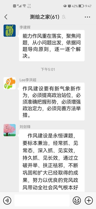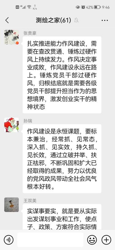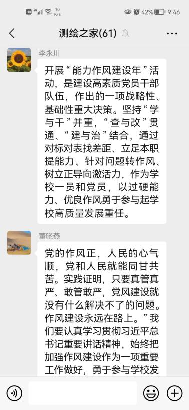 学习完毕,李孝雁、党争、陈慧、孔令惠四位教师做了现场发言,从本职工作出发,结合当前国内外形势和我院的实际情况,分享了自己对于作风建设的理解和学习感悟。其余教职工也纷纷在微信群中分享了学习体会。