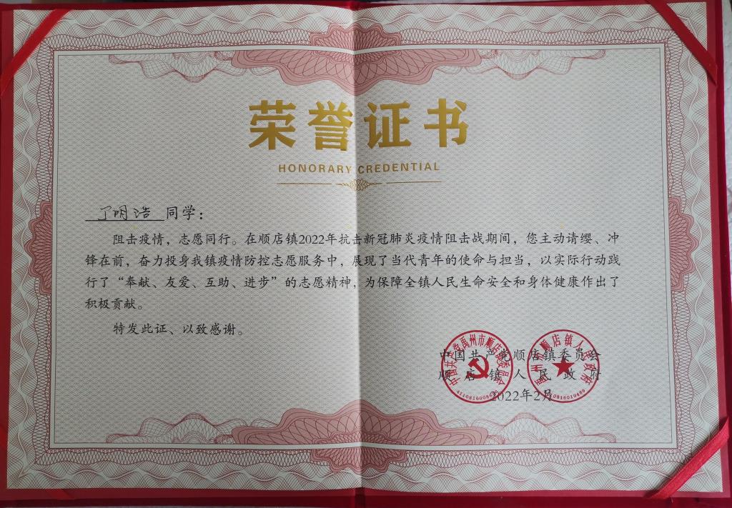 3 丁明浩获得顺店镇人民政府颁发的荣誉证书