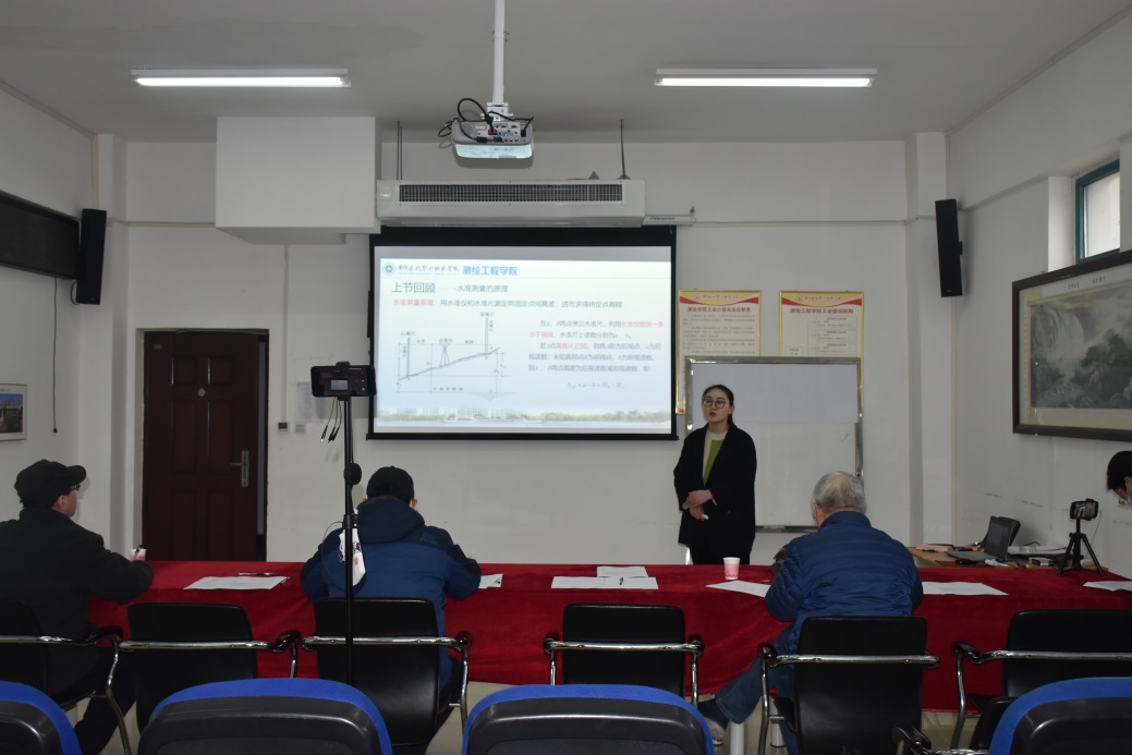 本次试讲共有4位老师,分别是韩清清、胡苗苗、黄金亭、赵颢迪。4位老师结合自己的专业,认真准备了试讲PPT,分别以“四等水准测量外业、内业”“地图投影的基本原理”“遥感概述”“计算机应用基础——文字处理软件word”作为试讲内容。4位老师在试讲中教态自然,吐字清晰,声音洪亮,对所讲内容熟练掌握,表达较规范,表现出良好的专业素质。
