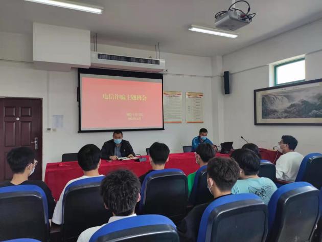 2022年4月11日,测绘工程学院在SY5434召开防电信诈骗主题班会。班会由辅导员李忠旺主持,并邀请党总支副书记彭战松为本次电信诈骗主题班会讲话。