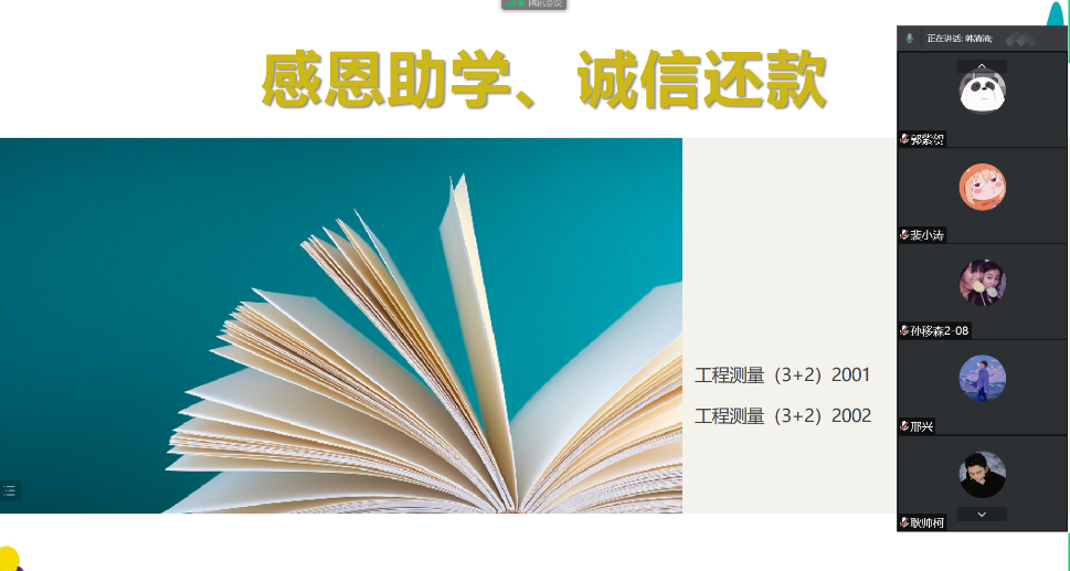 通过此次主题班会,工程测量(3+2)2001-2002班的所有国家高校助学贷款学生均已主动还款。同时,同学们表示十分感谢国家和有关机构的资助,承诺自己走出大学校门后一定会好好回馈社会,立志做一个对社会有用的有为青年。