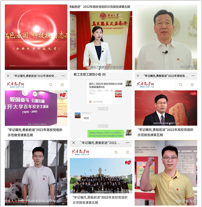 78日上午9点,测绘工程学院教工党支部支委成员带领工测党小组全体成员通过微信群在线观看了2022年高校党组织示范微党课展播第5讲。