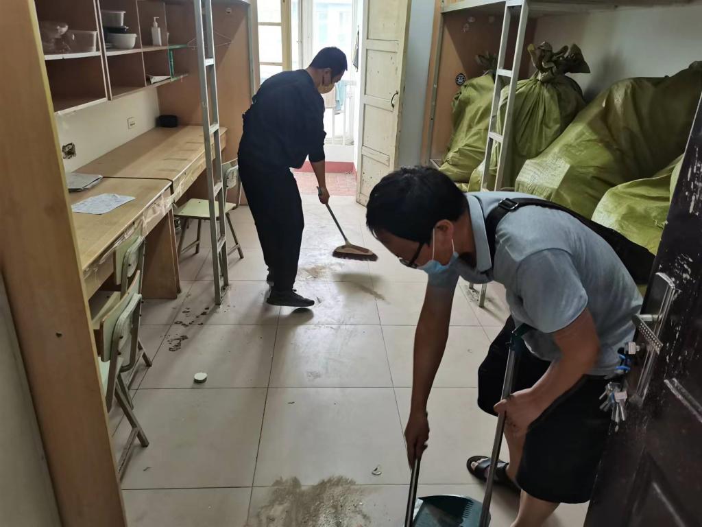 图4 教师党员在学生宿舍做清扫工作