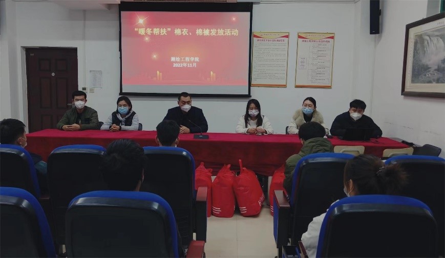 为扎实推进资助育人工作,助力学子温暖过冬,11月25日下午,测绘工程学院在学院会议室SY5434举行“暖冬帮扶”棉衣、棉被发放活动。测绘工程学院党总支副书记彭战松、辅导员和学生代表参加了此次发放仪式。