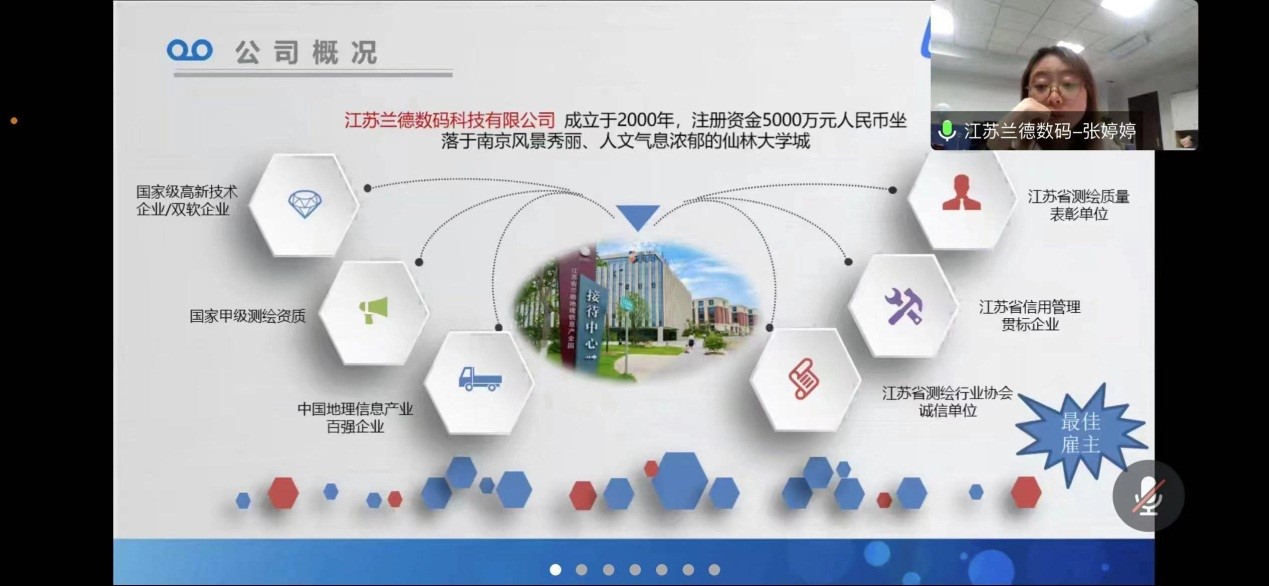 为推进测绘工程学院2023届毕业生就业工作,11月25日晚测绘工程学院邀请江苏兰德数码科技有限公司开展线上专场招聘会,江苏兰德数码科技有限公司人力负责人和2023届毕业生参加了本次招聘会。