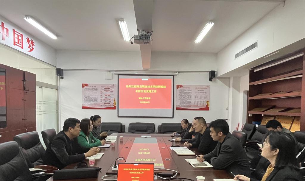 4月12日下午,商丘职业技术学院机电工程学院党总支书记陈英、师范学院党总支书记张瑞芳、交通学院党总支副书记刘帅一行在组织部副部长耿风带领下到我院考察交流党建工作。测绘工程学院党总支副书记彭战松、学生测绘工程一支部书记李忠旺、教工支部书记孔令惠及各支委委员在学院党员会议室接待了来访客人。