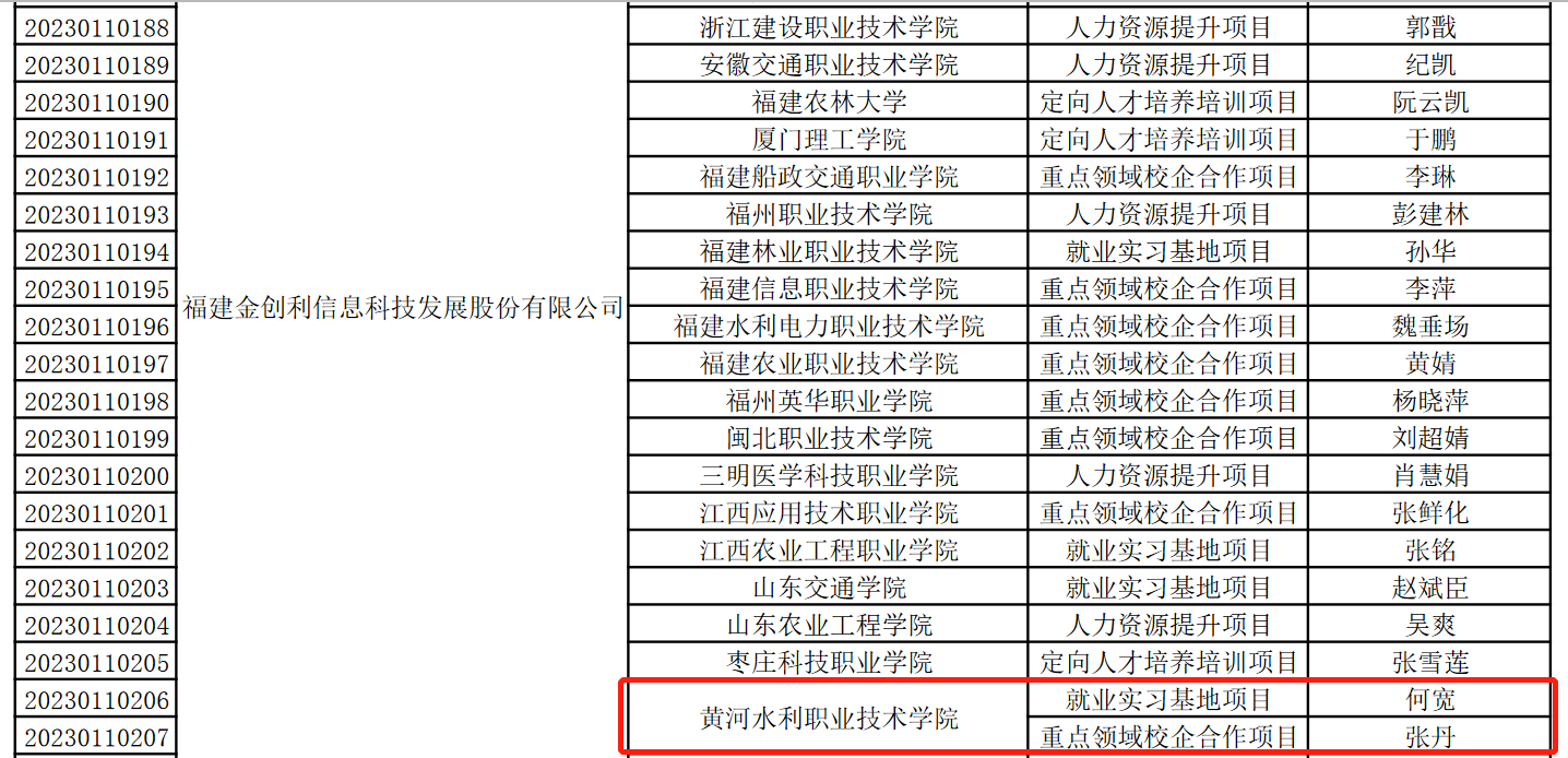 近日,教育部高校学生司正式发布了《关于公布第二期供需对接就业育人项目立项名单的通知》,我院共获批4项就业育人项目立项。其中,与福建金创利信息科技发展股份有限公司合作的科技服务行业供需对接项目2项,分别为副院长何宽主持的“yl8cc永利官网与福建金创利信息科技发展股份有限公司就业实习基地项目”和副院长张丹主持的“yl8cc永利官网与福建金创利信息科技发展股份有限公司重点领域校企合作项目”;另外,学院招生就业办公室主任李洪超主持的“与上海华测导航技术有限公司就业实习基地”装备制造业供需对接项目、陈琳教授主持的“与航天宏图信息技术股份有限公司就业实习基地”信息通讯与互联网行业供需对接项目亦同批获得立项。4个项目成功立项,标志着我院深入开展校企合作和产教融合的人才培养思路获得教育部的认可。
