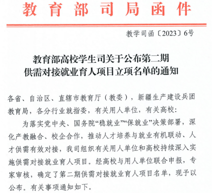 据悉,教育部供需对接就业育人项目是为深入贯彻《“十四五”教育发展规划》《国务院办公厅关于深化产教融合的若干意见》,落实党中央、国务院“稳就业”“保就业”决策部署,深化产教融合、校企合作,推动人才培养与就业有机联动、人才供需有效对接,由教育部高校学生司组织有关用人单位和高校实施的就业育人项目。