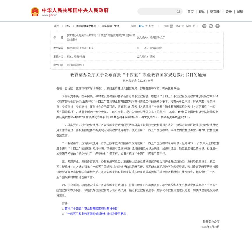 1 教育部办公厅关于公布首批“十四五”职业教育国家规划教材书目的通知