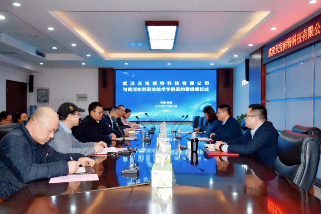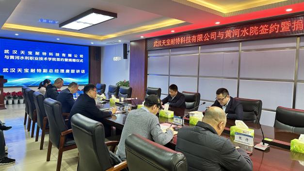 副校长朱焕立对武汉天宝耐特一行的到来表示热烈欢迎,并对武汉天宝耐特的慷慨捐赠表示感谢,希望借此次与武汉天宝耐特的合作契机,加强校企交流,将人才培养工作提升到一个新的高度,共同培育现代化高素质创新型人才,实现合作共赢。武汉天宝耐特副总经理唐甜对永利官网多年来专注于学生专业技能的培训,为企业和社会培养出一大批优秀的高素质技术技能人才表示敬佩,对永利官网毕业生进入工作岗位后所展示的专业能力、工作水平、敬业精神给予了高度肯定。