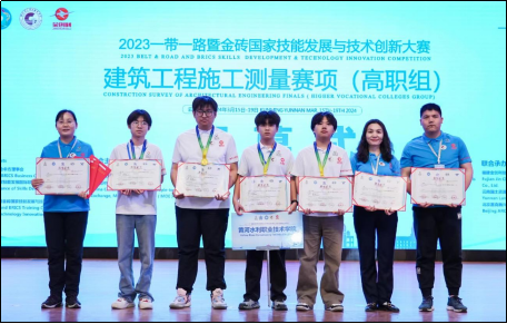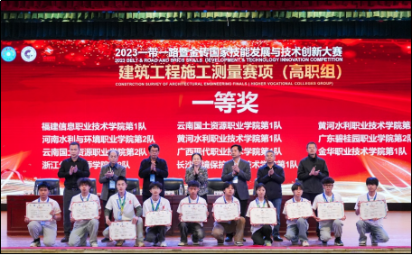 2024年3月16日—18日,2023“一带一路”暨金砖国家技能发展与技术创新大赛建筑工程施工测量赛项国内决赛(高职组)在云南国土资源职业学院举行。来自全国60余所院校、110个参赛队的220名选手同台竞技。经过激烈角逐,来自测绘工程学院地籍测绘2201班的丛挚洋、高政、于金旗、魏少阳4位同学组成的两支参赛队均获一等奖,永利官网获“最佳组织奖”,何宽、黄飒、孔令惠、石宇峰4位教师荣获“优秀指导教师”称号。