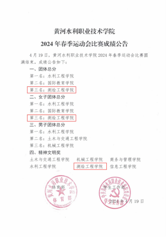 4月17日至19日,黄河水院2024年春季田径运动会在祥云体育场顺利举行。天气的炎热并没有影响测绘健儿们的斗志,反而更激发了他们奋勇拼搏、不惧挑战的意志。历经了三天的努力与拼搏,测绘学院最终取得了团体总分第三,女子团体总分第三的优异成绩,并荣获“精神文明奖”,为这个春天增添了一抹难忘的回忆。