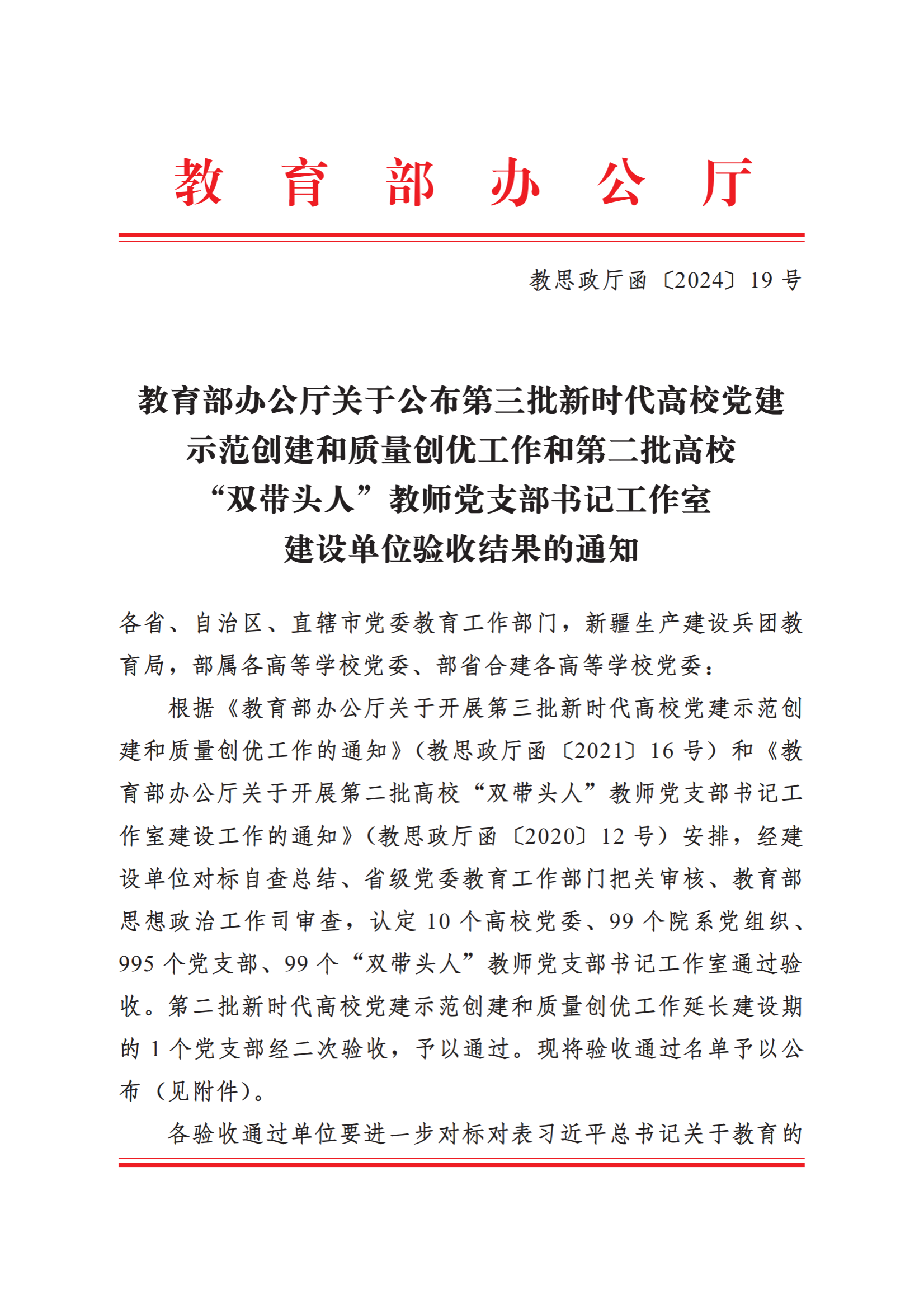 近日,教育部办公厅发布《第三批新时代高校党建示范创建和质量创优工作和第二批高校“双带头人”教师党支部书记工作室建设单位验收结果的通知》,测绘工程学院党总支顺利通过验收,获评第三批“全国党建工作标杆院系”。