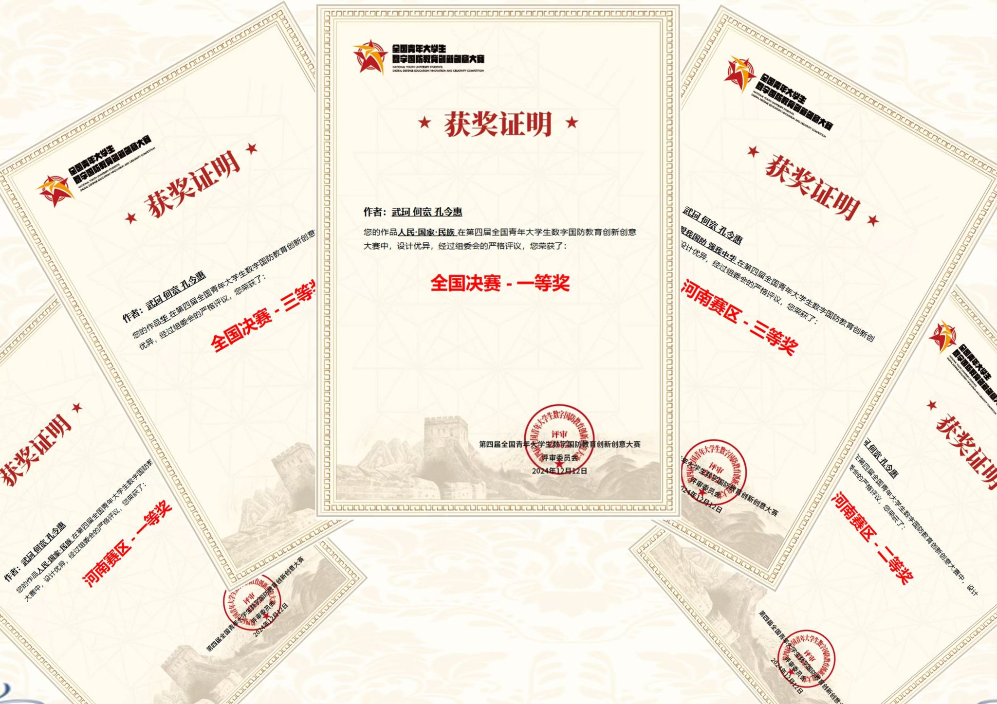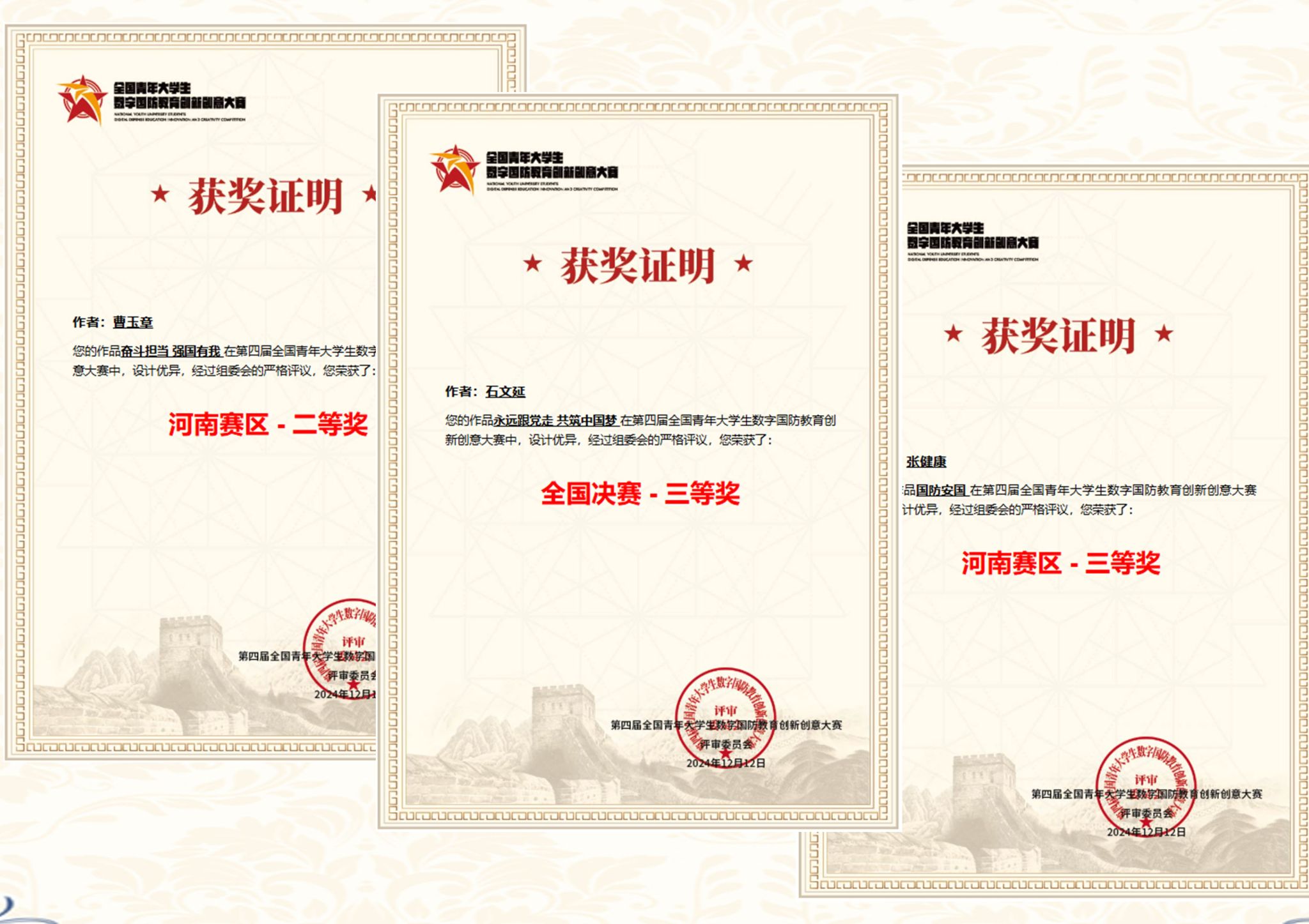 2024年12月12日,第四届全国青年大学生数字国防教育创新创意大赛决赛拉开帷幕。测绘工程学院选派教师武珂博士及学生曹玉章、石文延、张建康首次组队参赛,与来自全国各地参赛队伍同台竞技。经过激烈角逐,学生组获全国决赛三等奖1项和省赛二、三等奖各1项;教师组荣获全国决赛一、三等奖各1项和省赛一、二、三等奖各1项,并获优秀组织奖和优秀指导教师奖4项。