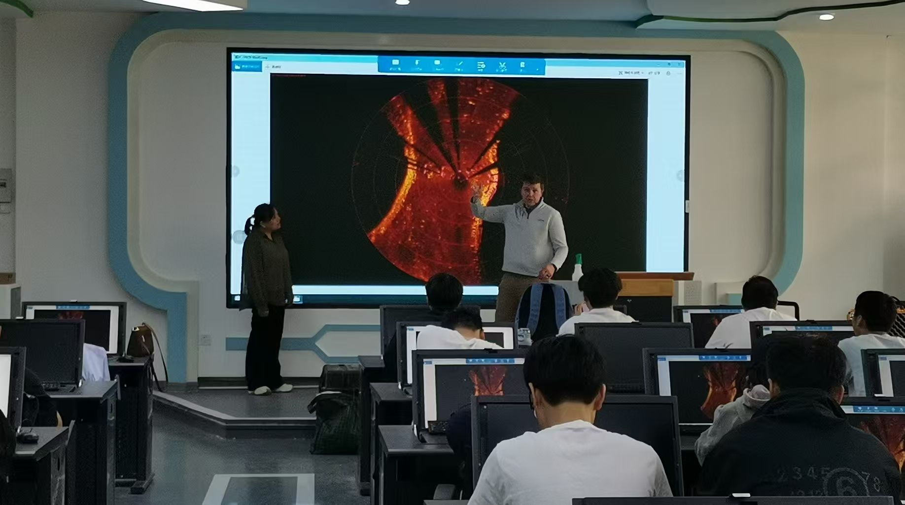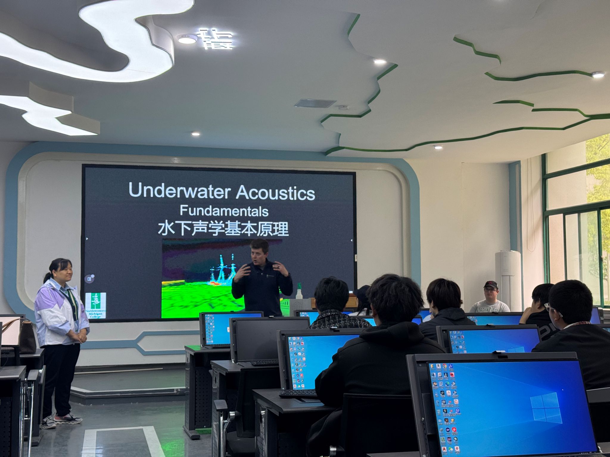 此次教学由理论和实训两部分组成。Tyler和John两位专业教师巧妙地运用课堂复习、提问、讨论等互动启发式课堂教学方法,用多媒体教学的方式讲解了水下声学几何原理和几种不同类型声呐的探测原理和使用方法,以及不同类型电缆线的焊接方法。期间穿插着ROV及扫描声呐安放及操控、系缆绳、图像解译、电缆线焊接等室内外实训教学。专业教师John还在4月23日在3号实训楼学术报告厅,针对中外合作办学专业的全体学生开展了主题“水下机器人ROV”讲座。