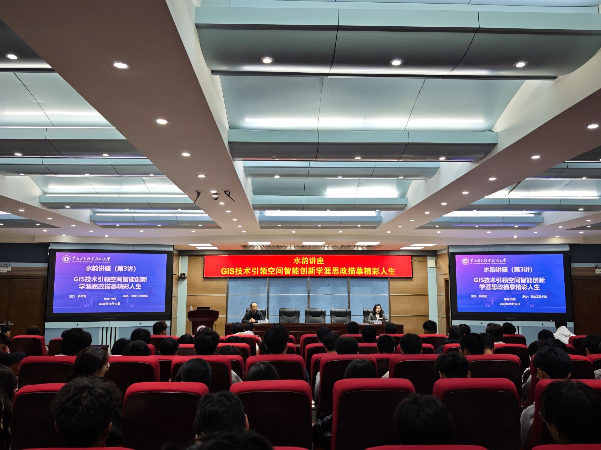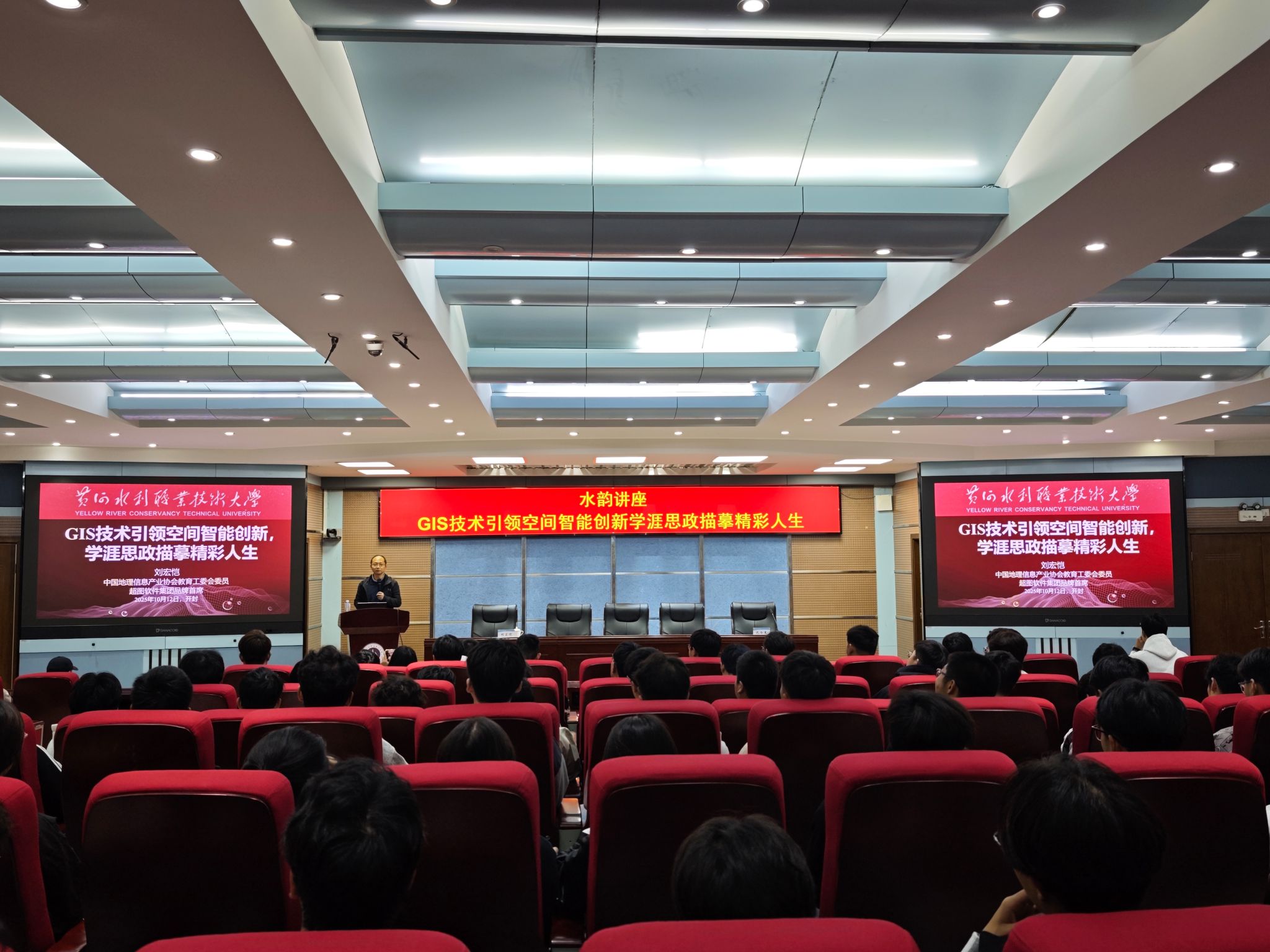 金秋十月,学术飘香。10月12日,测绘工程学院“水韵讲座”系列品牌活动于三号实训楼学术报告厅隆重拉开帷幕。首场讲座以“GIS技术引领空间智能创新,学涯思政描摹精彩人生”为主题,特邀行业领军企业——北京超图软件股份有限公司集团品牌首席刘宏恺先生担任开讲嘉宾,为学院师生带来了一场思想与前沿科技的盛宴。活动由学院副院长孔令惠主持,学院骨干教师及2025级新生代表参加讲座。