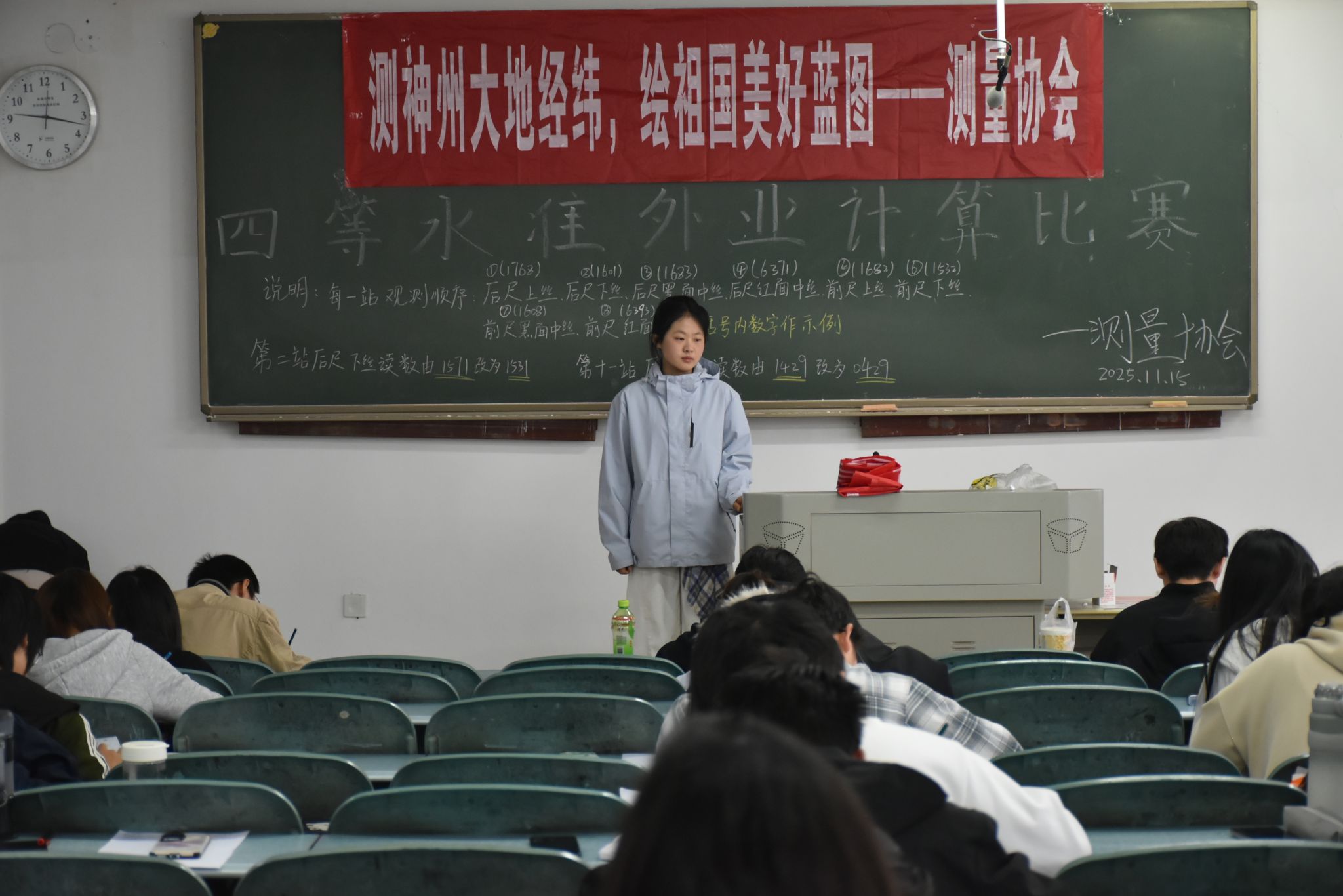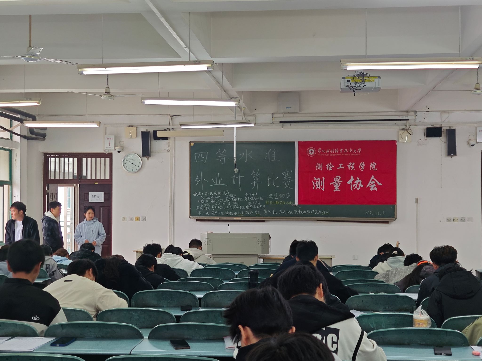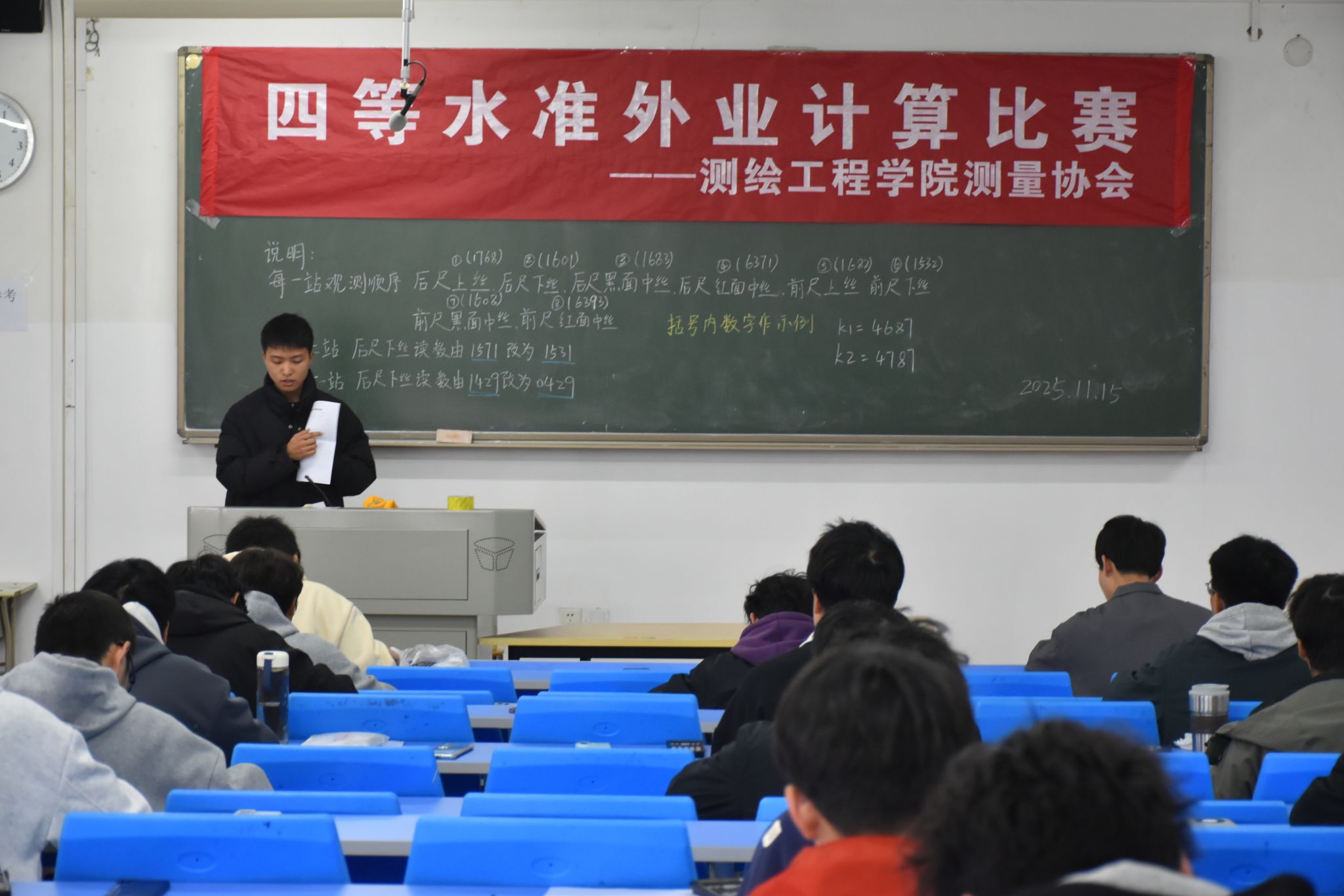 2025年11月15日,测绘工程学院测量协会在JX4303,JX4501和JX4503举办了“四等水准外业计算比赛”,共计198人参加了此次活动。该项活动的成功举办,为同学们搭建了一个兼具学习与交流功能的优质平台。同学们通过参与活动,在切实提升自身专业技能水平的同时,还进一步加深了对测量知识的学习兴趣。