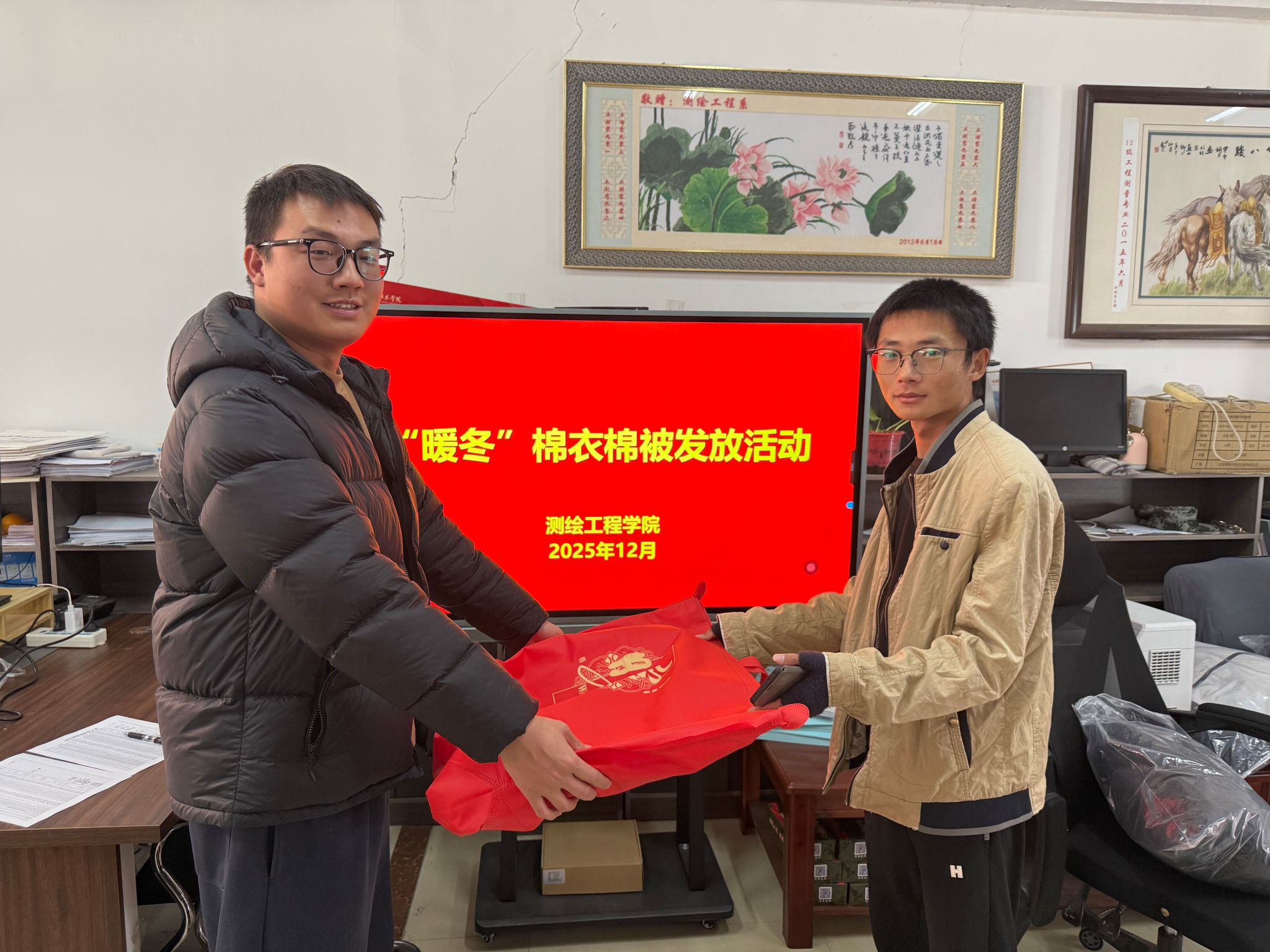 测绘工程学院长期以来坚持“资助与育人相结合、解难与励志相统一”的工作方针,不仅致力于为学生的专业学习保驾护航,也时刻心系大家的日常生活与身心健康。此次“暖冬行动”是学院落实精准资助、深化人文关怀的重要体现,希望这份实实在在的温暖能帮助同学们抵御严寒,更专心地投身于学业和实践中。