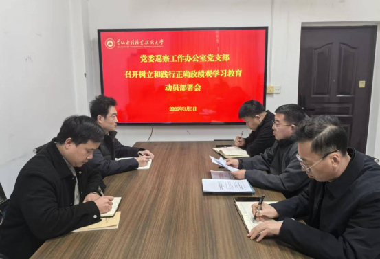 3月5日上午,党委巡察工作办公室党支部树立和践行正确政绩观学习教育动员部署会在行政楼325室召开。会议深入学习传达了习近平总书记关于树立和践行正确政绩观学习教育的重要讲话和重要指示精神及省委、省委教育工作和校党委(扩大)会议暨党委党的建设工作领导小组会议部署树立和践行正确政绩观学习教育工作会议精神,安排部署支部开展树立和践行正确政绩观学习教育工作。党支部全体党员参加会议,支部书记王振强主持会议。