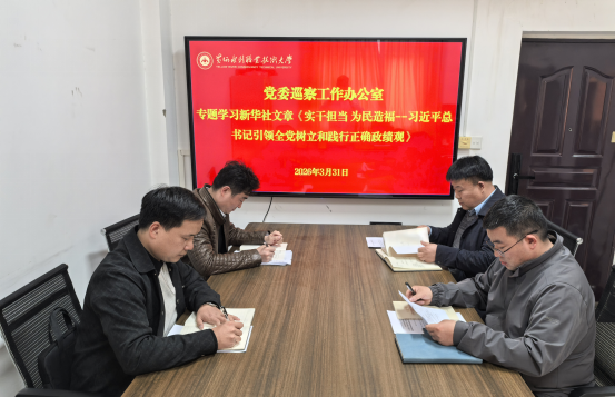 3月31日下午,党委巡察工作办公室在行政楼325室组织开展政治理论学习活动,集中学习研讨习近平总书记《实干担当 为民造福——习近平总书记引领全党树立和践行正确政绩观》及《让愿担当、敢担当、善担当蔚然成风》两篇文章,引导全体巡察干部以正确政绩观引领巡察工作,以担当作为践行初心使命。