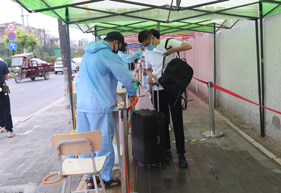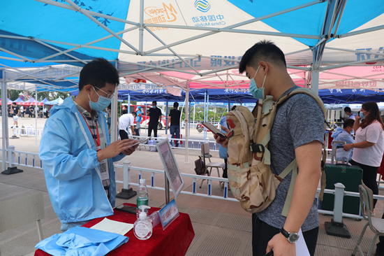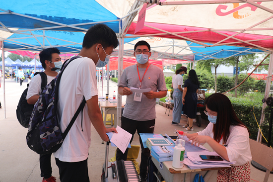 第三批返校复学学生为2020届毕业生。报到现场,工作人员认真做好交通疏导、身份核验、体温检测、信息登记、毕业生离校手续办理、发放毕业证等各项工作,为返校毕业生提供贴心的服务。各基层党组织组建的党员先锋队在学生返校工作中发挥先锋模范作用,环境工程学院党总支党员先锋队队员,骑来自家的电动车、三轮车帮助毕业生运送行李……一份行李袋、一瓶清凉的矿泉水、一声声“祝贺毕业、欢迎常回家看看”的亲切话语、一辆辆往返校门与宿舍的电瓶车、一条条温馨提示标语……让返校毕业生再次感受到了“回家”的亲切与温馨。(摄影:党委宣传部 郝迪婧 袁洪博)