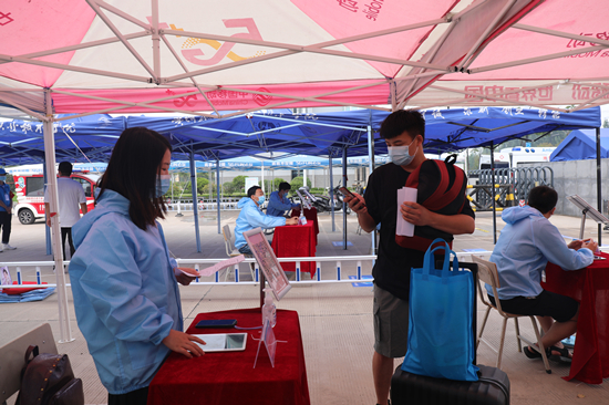 第三批第二阶段返校学生为参加2020年专升本考试的学生。返校当天,学子们有序佩戴口罩、间隔排队;工作人员认真做好身份信息核查、健康码核验、行李消杀、体温测量等工作,热心地引导每一个到来的学生完成规定流程,顺利进入校园,整个返校报到现场平稳有序。