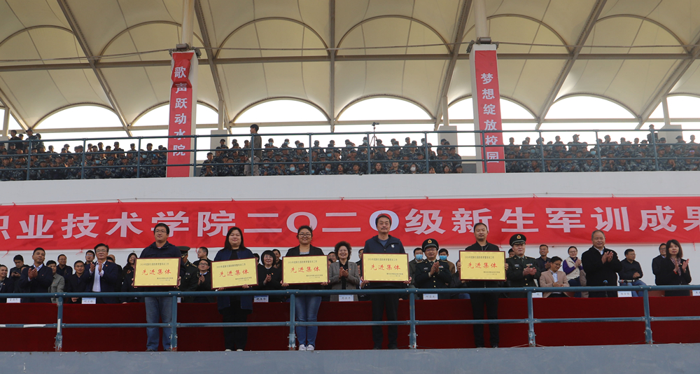 副校长焦爱萍宣布了新生国防教育暨军训工作先进集体、“十佳”组训标兵、优秀军训教官、优秀军训学员、优秀辅导员助理等名单。主席台就座的领导向获奖单位和个人颁发了奖牌和证书。(摄影:党委宣传部 郝迪婧 袁洪博 信息化管理办公室 张飞阳)