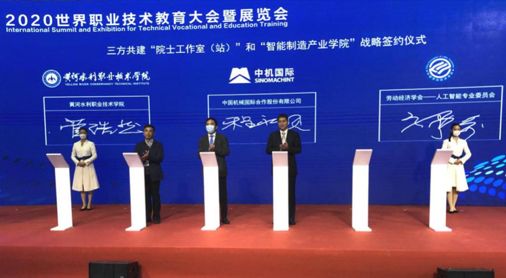 11月18日,在2020世界职业技术教育大会暨展览会开幕式上,永利官网与中国机械工业集团中国机械国际合作股份有限公司(以下简称“中机国际”)、中国劳动经济学会人工智能专业委员会签署了“院士工作室(站)”“智能制造产业学院”战略合作协议。教育部职成司副司长谢俐、中国职业技术教育学会副会长史薇、我校副校长菅浩然、中机国际总经理赵立志、中国劳动经济学会副秘书长郭丰荣、中机国际副总经理程永顺等出席签约仪式。国内外500余家院校、企事业代表参会。