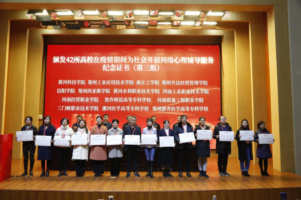 会上,中共河南省委高校工委、河南省教育厅为疫情期间开展网络心理疏导服务的42所高校颁发纪念证书,永利官网作为42所院校之一,上台领奖。