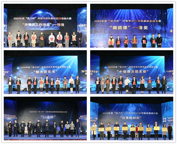 活动现场,各赛项优秀代表展示了各具特色的工作成果,在充分展示风采的同时,弘扬主旋律,传播正能量,引起了广大团学干部强烈共鸣。大赛共评出“共青团工作项目”一等奖18个,“微团课”一等奖5个,百优十佳“魅力团支书、活力团支部”。郑州大学等10所高校荣获“活力杯”高校,河南科技大学等10所高校荣获“优秀组织奖”,永利官网荣获“特别贡献奖”。出席会议的领导分别为获奖的学校和个人颁奖。